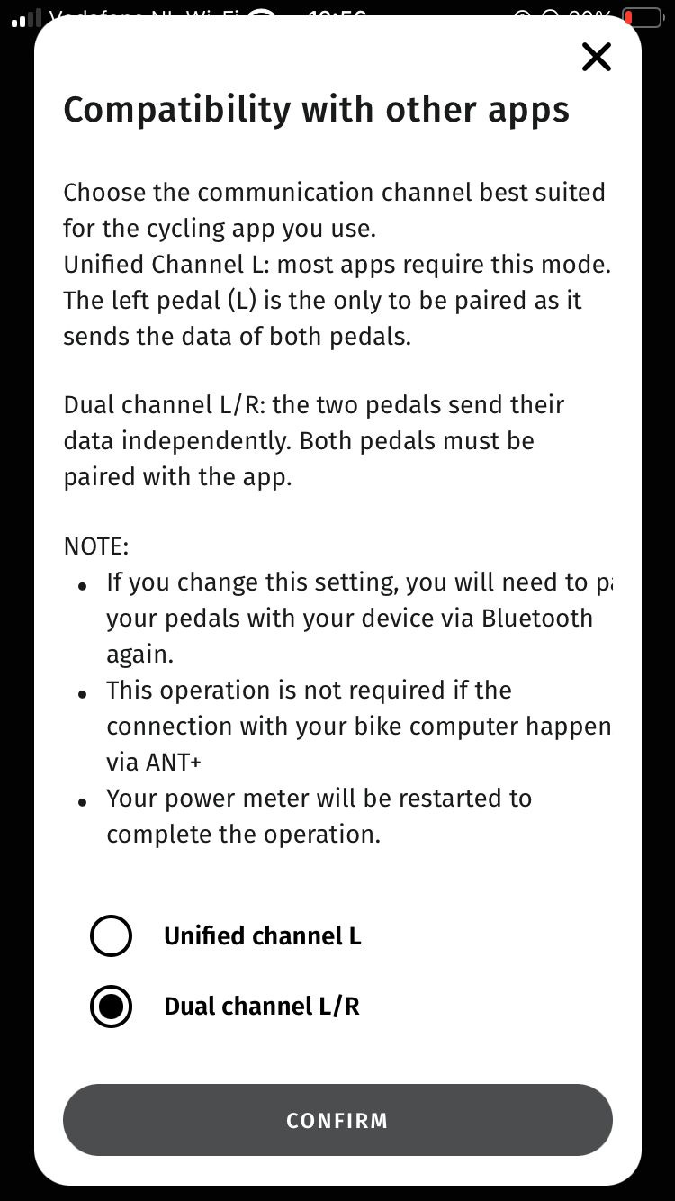 First off, they are great (nospon). They rarely vary >0.5% from the power readings on my Wahoo Kickr v6 bike trainer. Extremely satisfying. Only recently I discovered (yes I know, you have higher expectations of me🤓), that I need to turn on dual channel in the app to actually get L/R and cycling dynamics data on my Garmin head unit.
