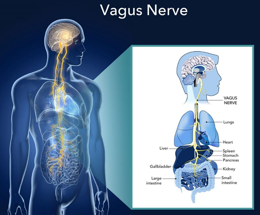 The vagus nerve runs from the brainstem down through the neck, chest, and abdomen, branching out to the heart, lungs and digestive organs. There are several ways you can stimulate the vagus nerve: